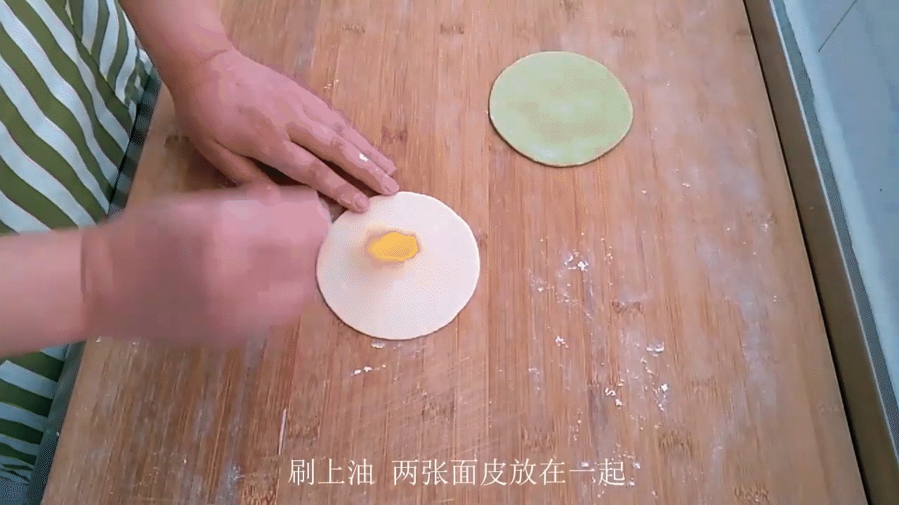 1.擀出圆形面片,将下层圆形面片刷油,上层叠一张面片。