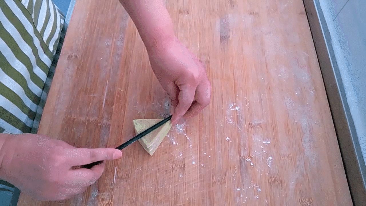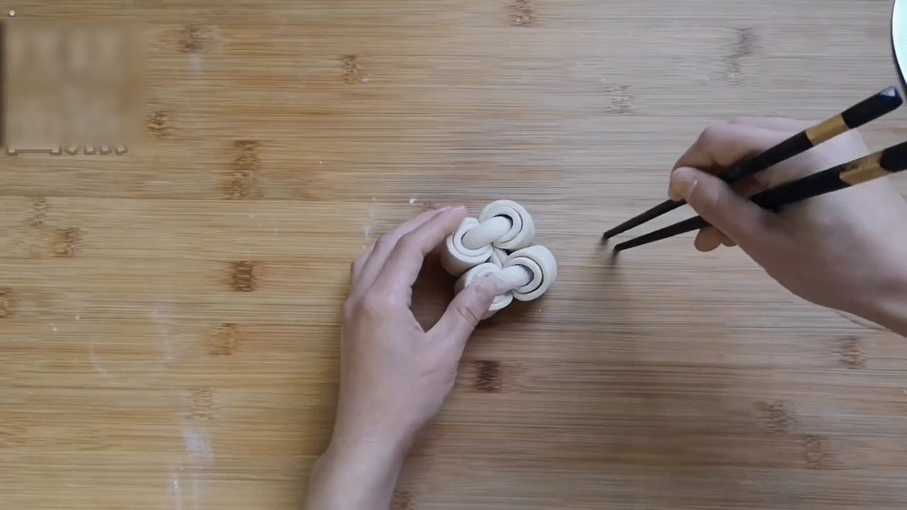 2.将3块圆形面片,全部对折后放在一起, 然后用筷子用力夹一下。