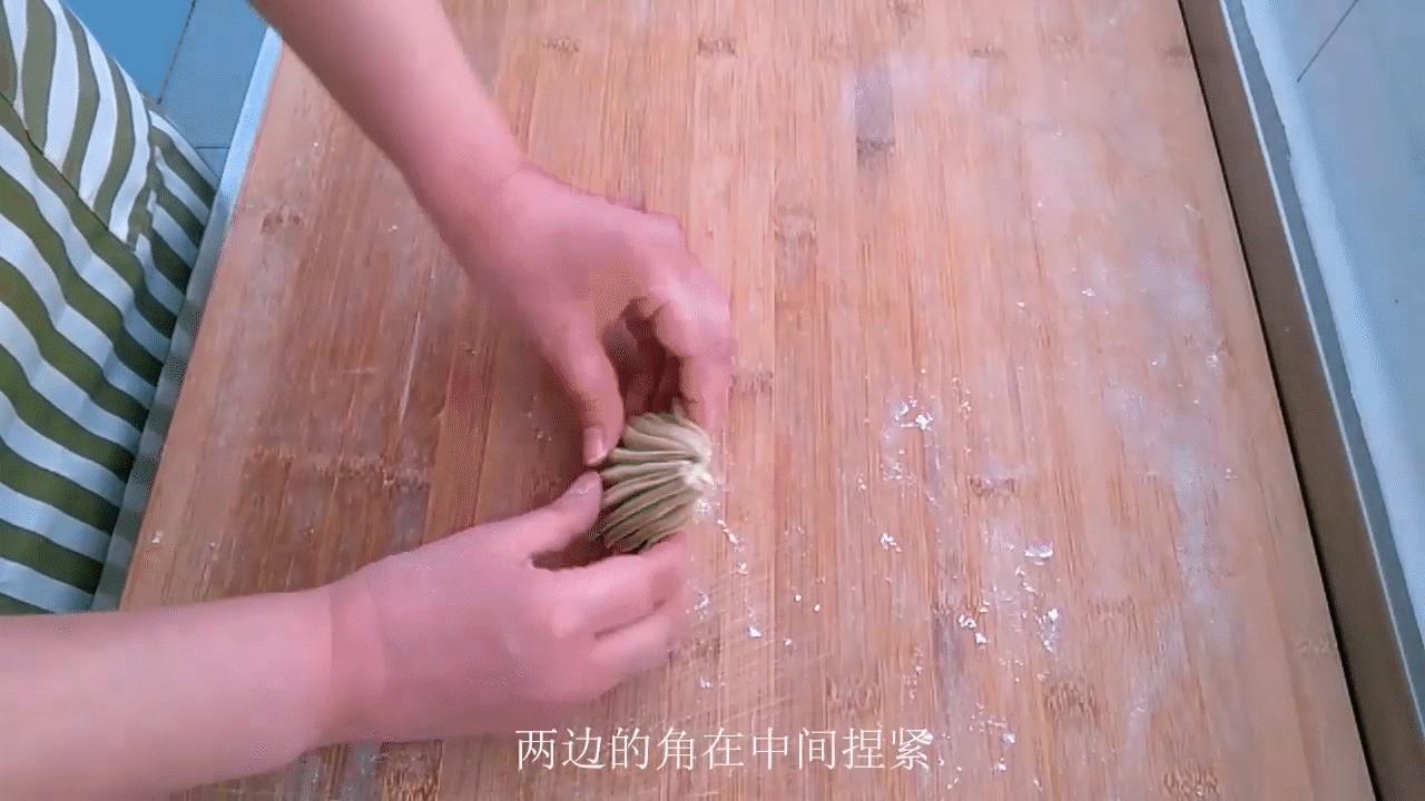3.将面片翻个面,把4个角收拢往中间挤压。