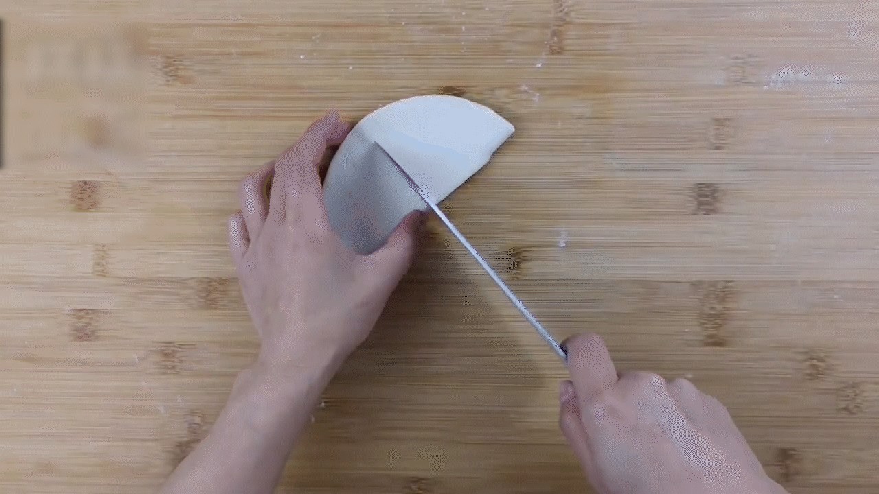 5.在叠放好的扇形面片底端圆弧处横着切一刀,然后就得到了一段弧形的面团,和一个三角形的面团,然后把两段面片立好。
