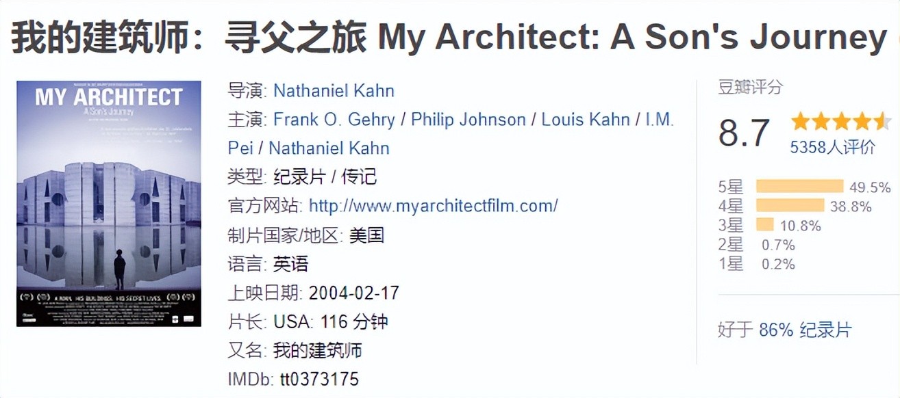 本部纪录片讲述美国费城著名建筑师路易斯·I·康因,这位曾设计过众多著名建筑的伟大建筑师生前有关事业和家庭的故事。这是一部有关爱与艺术的影片,也是一部讲述背叛和原谅的故事。从宾夕法尼亚火车站的地下走廊到人潮汹涌的孟加拉首都达卡的国家议会大厦,在这些美轮美奂的不朽作品中,我们似乎看到了这位20世纪下半叶被很多建筑历史学家公认的最具影响力的天才惊人的创造力。然而在生活中,路易斯却是一个既神秘又矛盾的丈夫、父亲。路易斯有着三段不同的家庭生活,执导本片的导演纳撒尼尔·康恩正是路易斯的其中一个儿子。由美国导演纳撒尼尔·康恩执导的人物传记纪录片《我的建筑师》,荣获2004年第76届奥斯卡金像奖最佳纪录长片提名等多项纪录片大奖。