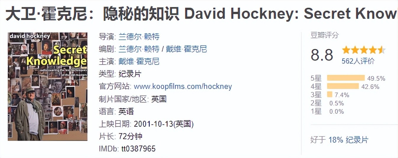 2019年,大卫·霍克尼的《大水花》展览,吸引了很多展览爱好者前往观展,这部纪录片,可以让观众更加深入地了解艺术家。大卫霍克尼提出了一个吸引人的理论,不仅指出西方一些伟大的艺术作品是借助镜子和透镜画成的,而且讲述了光学镜头的观看方式如何逐渐主宰绘画作品面貌的过程。