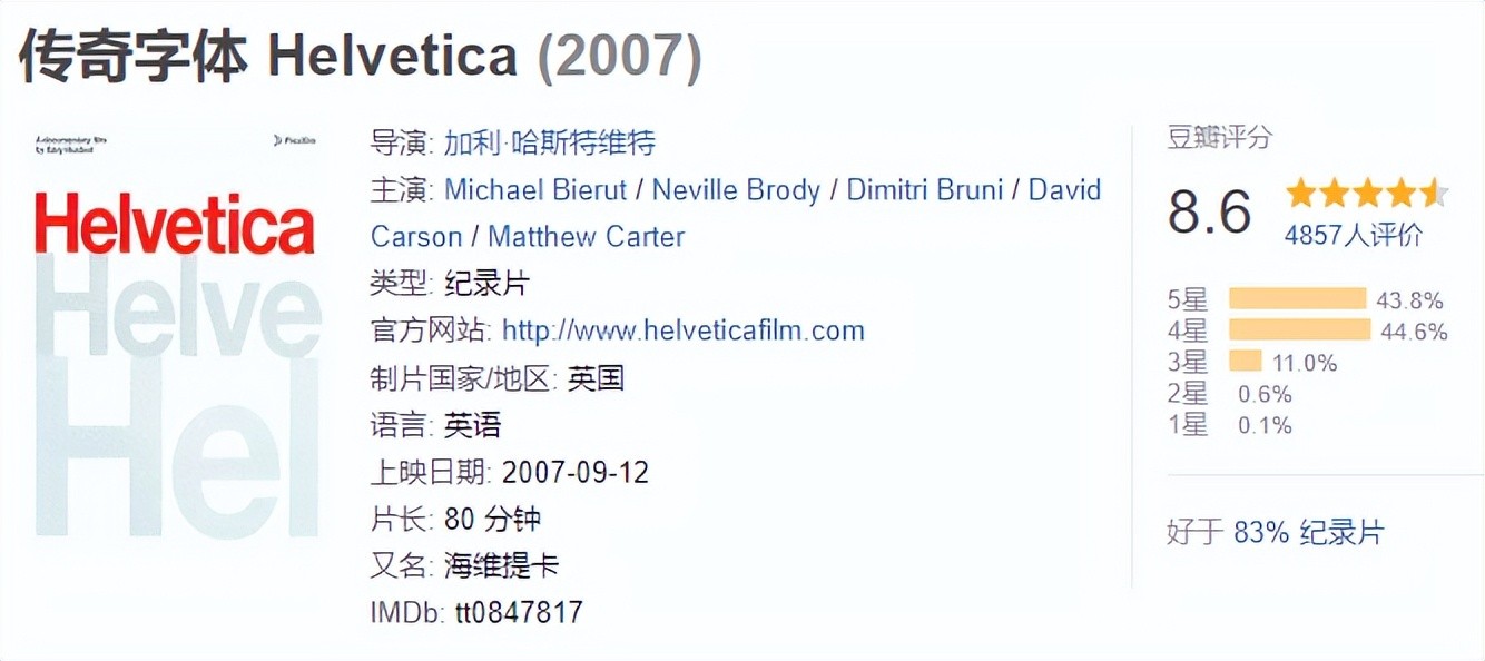 由独立制片人导演Gary Hustwit执导拍摄的纪录片《传奇字体》,讲述了Helvetica字体从起源诞生到它的特性和影响力,影片访谈了不同时期的老中青三代设计师,畅谈这款简洁、直接、醒目的传奇字体背后的故事。1957年,新字体Helvetica由麦克斯·米耶丁格和爱德华德·霍夫曼在瑞士Münchenstein的哈斯铸造所作为排版铅字制作。新的工业化时代正在来临,这种容易辨识和阅读的字体形式更适应快节奏的生活和工业化生产的需要,很快风靡世界。2007年,Helvetica字体诞生满五十周年。Helvetica字体已然存在于我们随处可见的任何一处角落,几乎成为了工业文明和机械化的象征。
