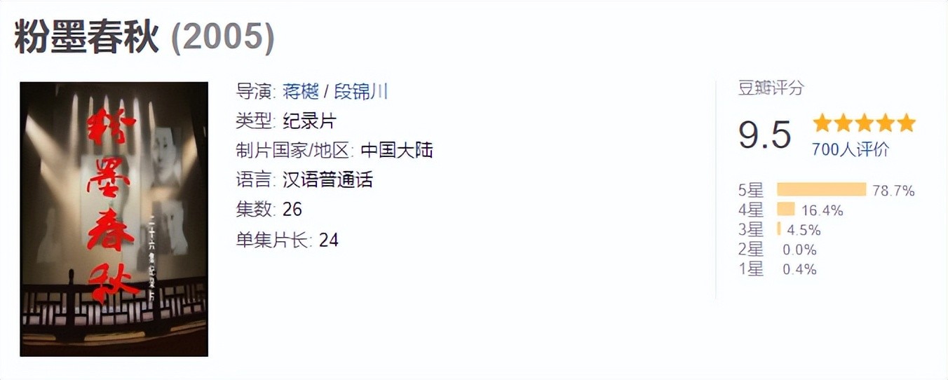 大型纪录片《粉墨春秋》是迄今为止国内首部反映京剧历史的纪录片。本片一共26集,每集24分钟,从扬州到京城,从民间到宫廷,从红遍京城到普天同唱一首歌,京剧形成和发展的历史脉络在片中以精美的图像和多角度的讲述生动地呈现。