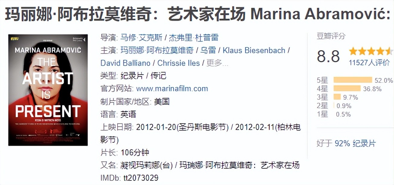 本片跟随记录了素有当代行为艺术祖母之美誉的塞尔维亚行为艺术家玛瑞娜·阿布拉莫维克于2010年在纽约现代艺术博物馆MoMA举行的大型回顾展Marina Abramovic: The Artist Is Present的全过程。该次展览中,艺术家曾经最著名的几件行为艺术作品通过受邀的30位年轻当代艺术家重现,而玛瑞娜·阿布拉莫维克本人则在对艺术与人类无限的追逐反思中再次创作了一件惊世骇俗却又动人心扉的行为艺术作品。同时本片还回顾了玛瑞娜·阿布拉莫维克与曾经的灵魂伴侣Ulay之间的爱恨情仇。而Ulay与玛瑞娜在表演现场的和解也让所有人为之动容。本片获得2012年圣丹斯电影节、2013年美国独立精神奖等多项提名,并夺得2012年柏林国际电影节大奖。