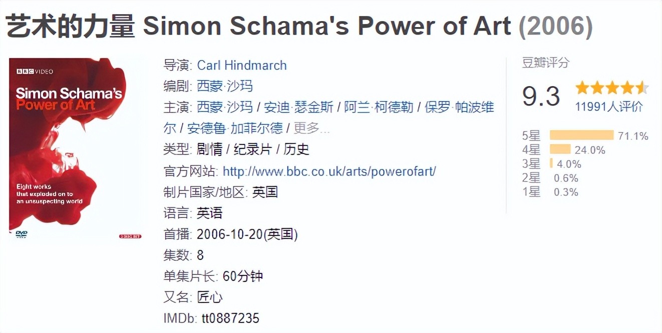 八集BBC年度巨献纪录片《艺术的力量》,将为您详细讲述卡拉瓦乔、贝尼尼、伦勃朗、雅克、透纳、梵高、毕加索以及罗斯科八位艺术家的生平,重现这八位艺术大师的创作历程。八位艺术大师拥有自成一派的创作风格和鲜明的个性,本片将全面剖析艺术大师们孕育和诞生艺术品时扣人心弦的故事。