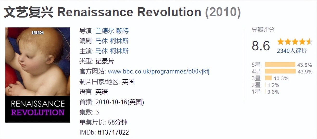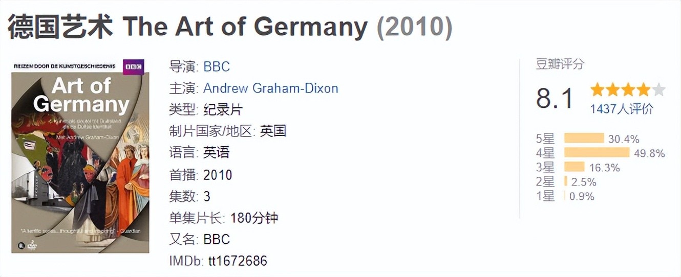 BBC纪录片《德国的艺术》,展现德国在意大利文艺复兴时期的历史文化的艺术气息,分为三集:Part 1: A Divided LandPart 2: Dream and MachinePart 3: In the Shadow of Hitler文艺复兴是指13世纪末在意大利各城市兴起,以后扩展到西欧各国,于16世纪在欧洲盛行的一场思想文化运动,带来一段科学与艺术革命时期,揭开了近代欧洲历史的序幕,被认为是中古时代和近代的分界。主持人Andrew Graham-Dixon用不同的主题去探讨德国的艺术,包括景观、民俗文化等,为那些对世界艺术和文化传统不太熟悉的人群开阔了视野。