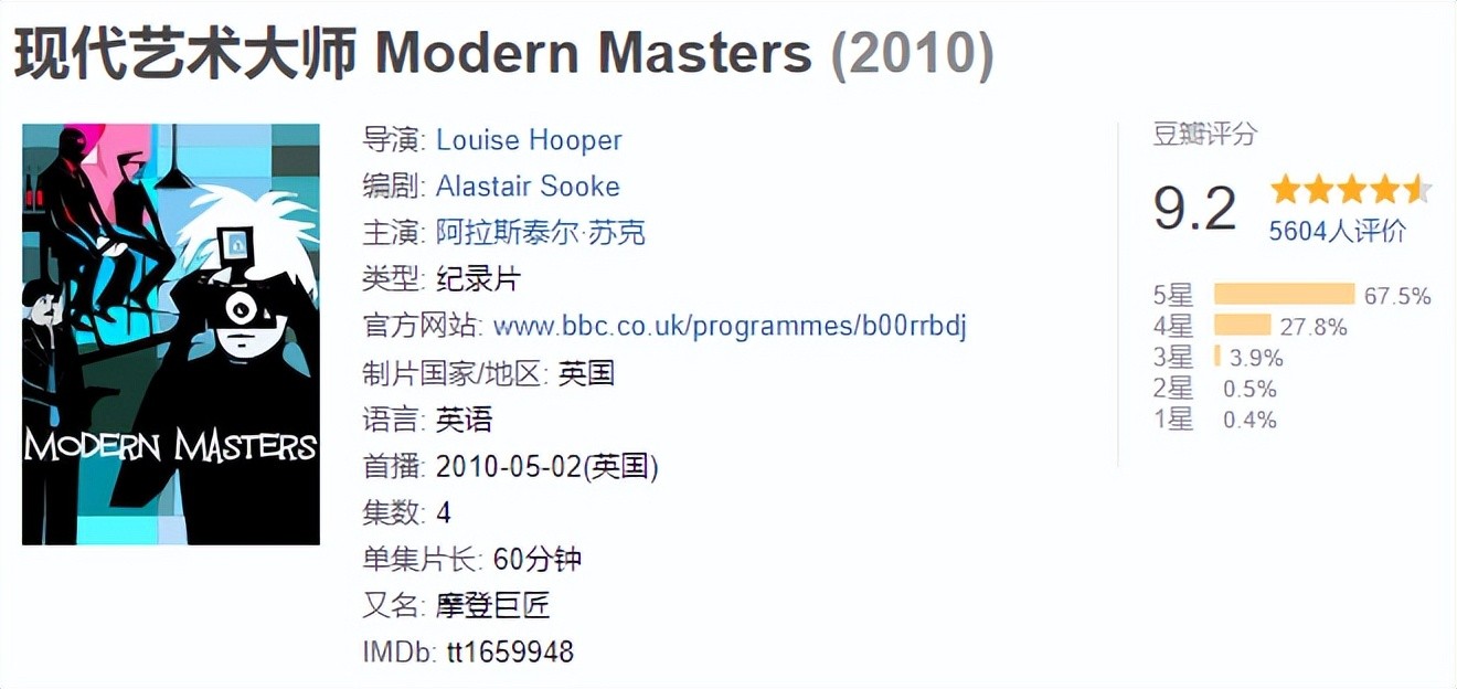 《现代艺术大师》是英国广播公司BBC推出的一档电视系列节目,它由四部分组成,分别详细介绍了20世纪的四位重要的艺术大师:安迪·沃霍尔(Andy Warhol)、马蒂斯(Henri Matisse)、毕加索(Pablo Picasso)和达利(Salvador Dali)的工作与生活。在片中,镜头跟随主持人的脚步,走访了四位艺术家们生前的居所、艺廊及博物馆,甚至是他们最爱的餐厅等地,向观众展示了他们伟大的艺术贡献以及惊人的后世影响力。环顾四周,麦当娜的专辑封面、米菲兔的文具、甚至是你家的沙发和电话,也许就来源于这四位大师的创作。