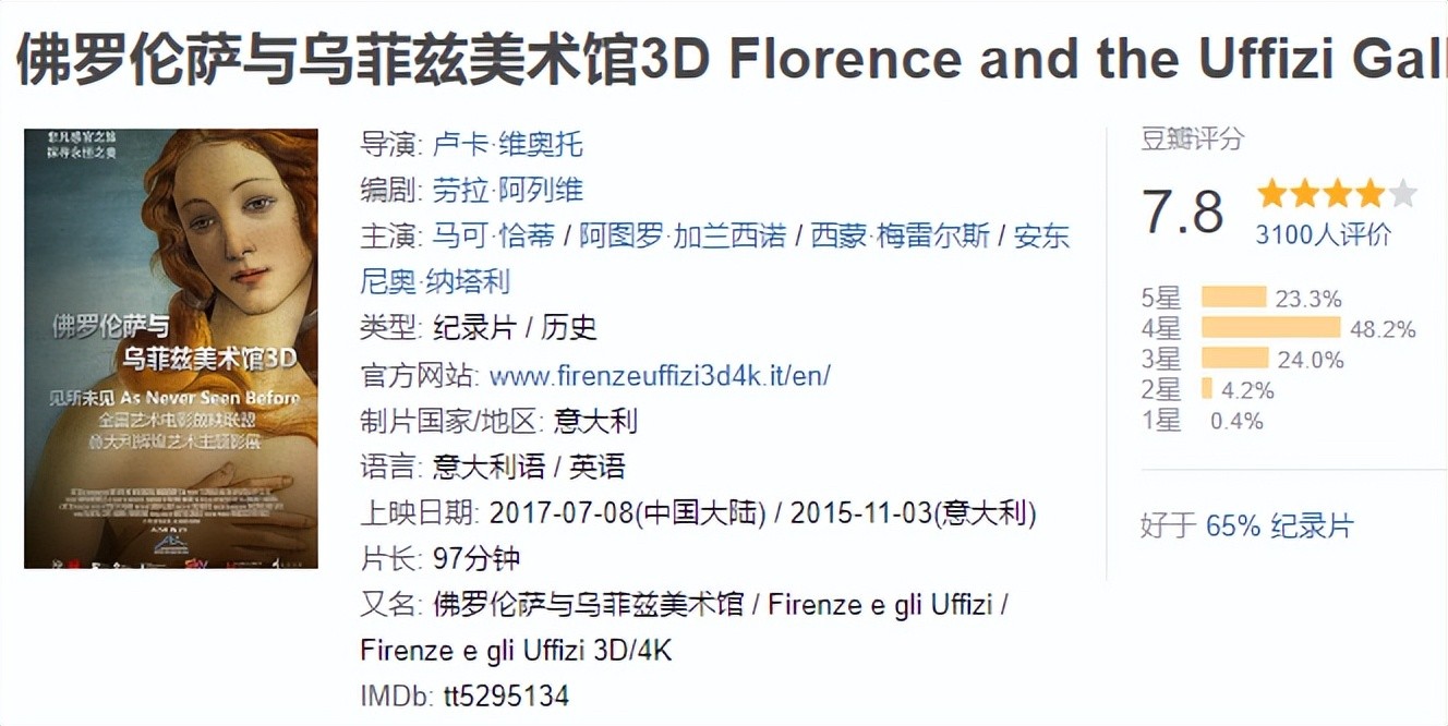 《佛罗伦萨和乌菲兹美术馆》远不止是一部关于经典艺术的纪录片,而是一段以多维度、多媒体视听盛宴的方式,通过剖析当时最美最具代表性的艺术作品,深度探寻意大利文艺复兴的旅程。在世界电影史上,我们首次迎来了一部关于真正的露天美术馆——佛罗伦萨的艺术电影。