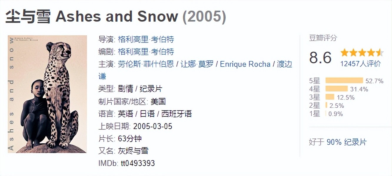 《尘与雪》是一部美得足以令人窒息的纪录片,它是一部活动的摄影集,每一帧单独抽出来都可以成为令人驻足观赏并流连忘返的摄影精品。影片始动于1999年,加拿大籍摄影师格利高里·考伯特(Gregory Colbert)的作品受到许多收藏家的青睐。在此之后,他的足迹更延伸到埃塞俄比亚、纳米比亚、汤加等国家。