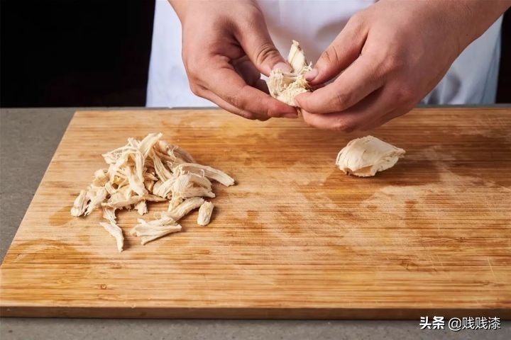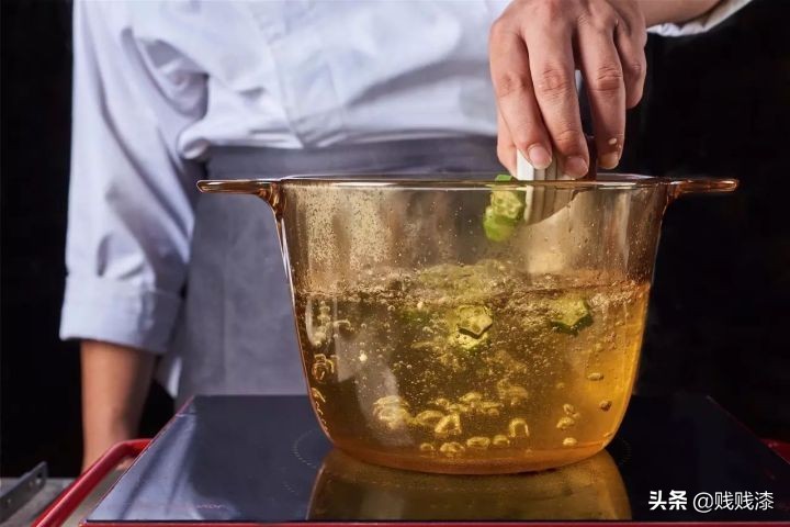 2、玻璃锅加满水煮沸(9档),放入秋葵焯熟后迅速放入冰水冷却;将整块鸡胸肉放入水中焯熟,取出后迅速用纸巾吸干,手撕成条状;
