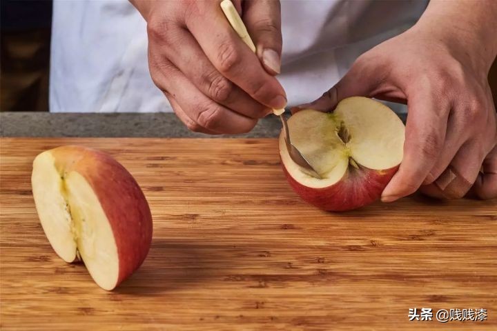 3、苹果洗净对切成块,用铁勺挖空,将粘稠状的焦糖果仁倒入送冰箱冷冻5分钟;