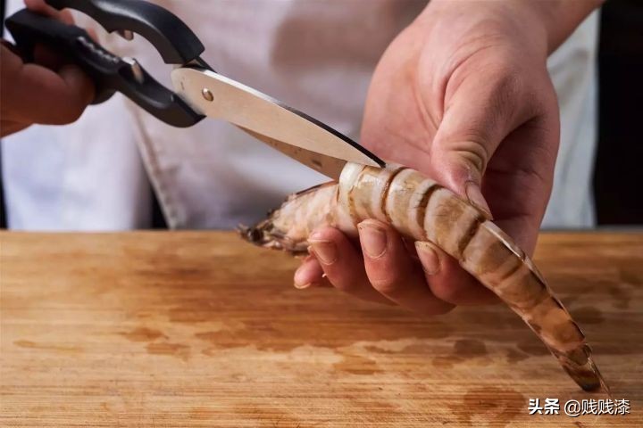 1、大虾洗净从背脊部切入,挑去虾肠,用纸巾吸干水份备用;