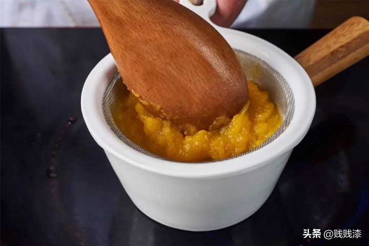 2、南瓜块煮成稀状后顺时针不断搅拌,将南瓜羹转入小奶锅(1档),用滤网滤出南瓜汁;