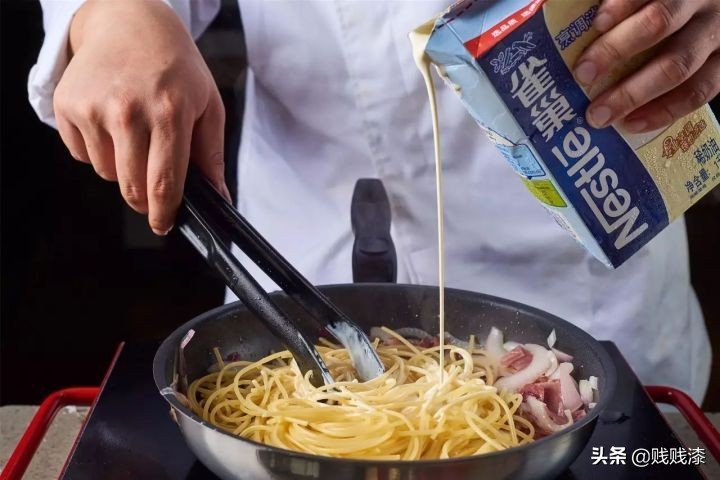 3、不粘锅加热(3档),放入适量橄榄油,放入洋葱圈煸炒(4档)后加火腿片,加意面翻炒同时倒入鲜奶油,小火熬煮(4档);