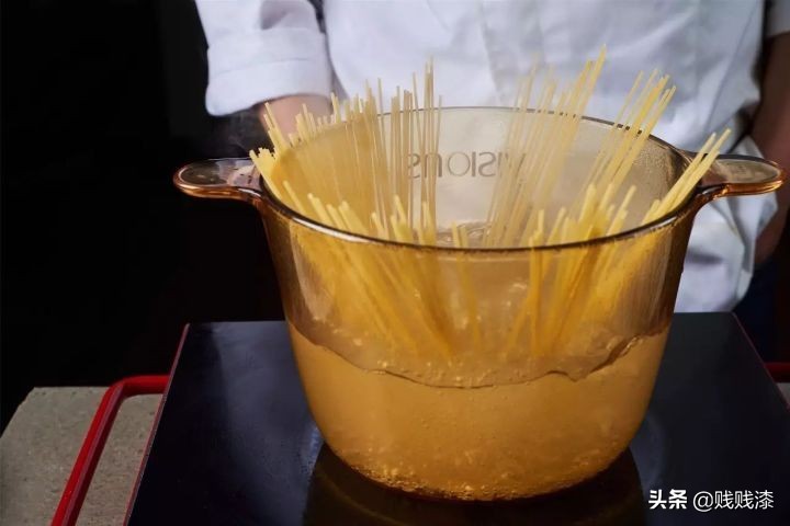 2、汤锅加水煮沸(9档),煮意大利面,沥干水份备用;
