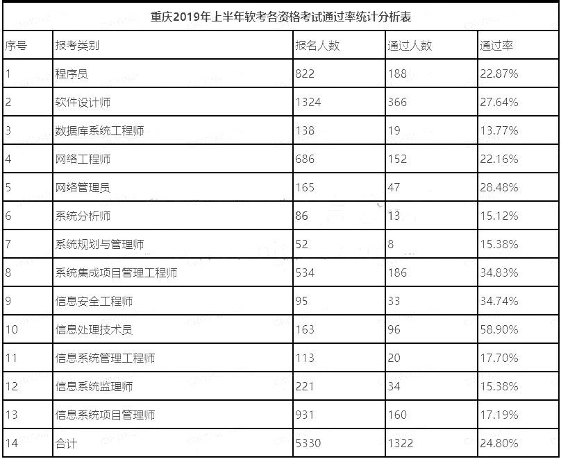 官方没有公布软考的通过率,但一些地区做了统计。例如,2020年浙江宁波的软考通过率约为25%,20年镇江的通过率约为33.27%,2019年重庆的通过率是24.8%。