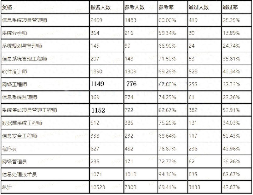 软考的初级通过率大约是30%,中级通过率大约是20%,高级通过率大约是10%。其中,比较困难的科目的通过率会更低,比如高级的系统架构设计师和系统分析师,有时候只有8%的通过率。