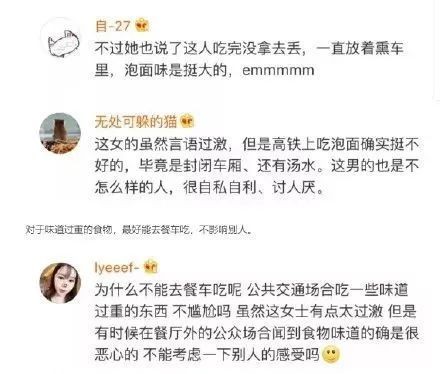我们讨论这件事情,不是指责男乘客不应该吃泡面,对于高铁上能不能吃泡面我的态度就像《问题大了》里嘉宾所说的那样:“你有带泡面的权利,我也尊重你的权利,但是带上去了吃不吃,怎么吃,就是你个人修养决定的”,我们要说的是面对问题的态度,面对问题时应该抱着解决问题的态度,而不是被负面情绪支配,不仅不解决问题,反而在问题上制造问题,当然从女乘客那里我们也要认识到情绪管理的重要性。