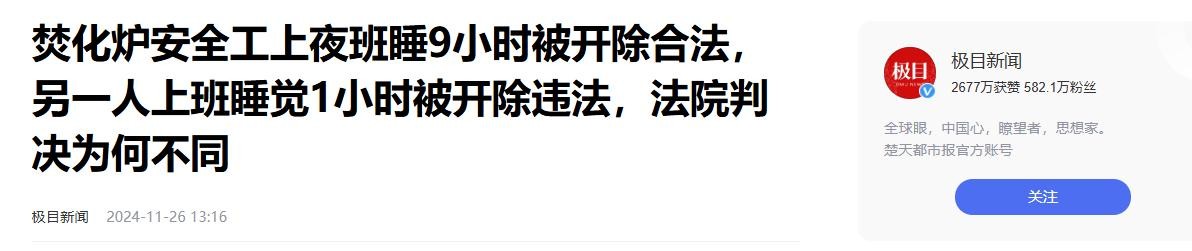 极目新闻【2024-11-26】《焚化炉安全工上夜班睡9小时被开除合法,另一人上班睡觉1小时被开除违法,法院判决为何不同》
