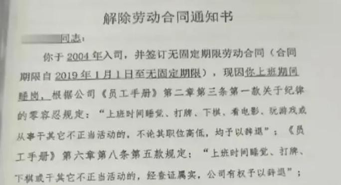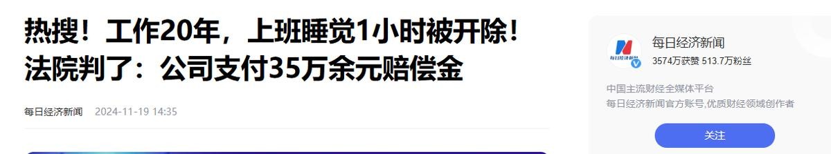 信源:每日经济新闻《热搜!工作20年,上班睡觉1小时被开除!法院判了:公司支付35万余元赔偿金》
