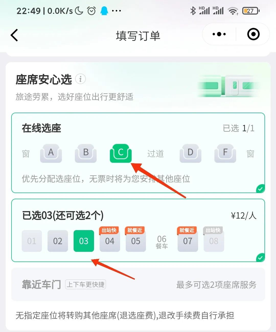 完成乘客信息填写后,就到了选座环节。线上提供了多种选座方式,包括靠窗、过道、指定车厢、靠近车门等,每种座位都有其独特的优势,大家可以根据自己的实际需求进行选择。需要注意的是,选座位会产生额外的费用,所以如果没有特殊需求的话可以直接跳过这一步。
