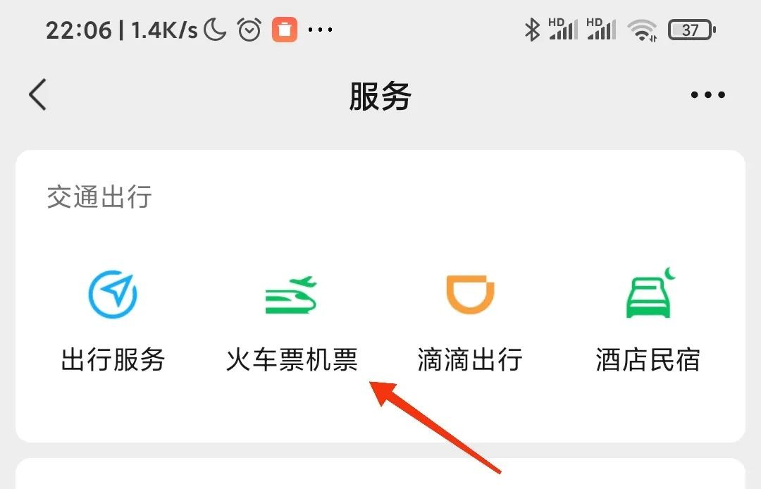 打开微信,点击右下角的“我”,找到并点击“服务”选项。在“服务”页面中的“交通出行”选项中里找到“火车票机票”选项并点击打开,即可进入微信火车票购票界面。
