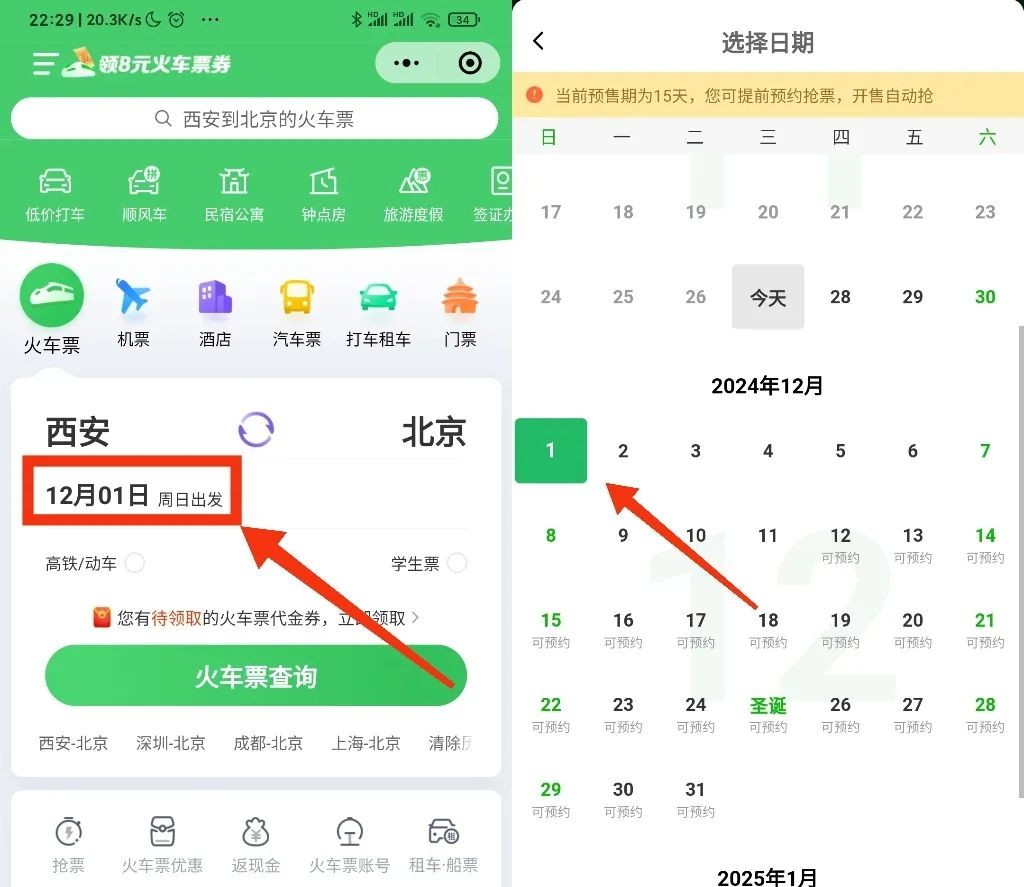 1. 选择好出发地和目的地后,接着选择出发日期。目前火车票的预售期通常为15天,在这15天内可以直接选择出行日期。例如,今天是11月27号,那么可以直接购买到12月11号的票。