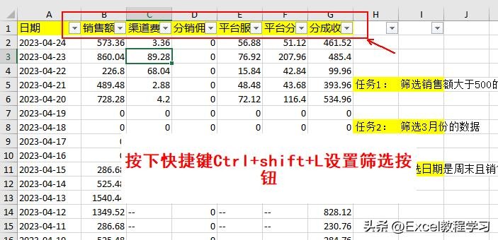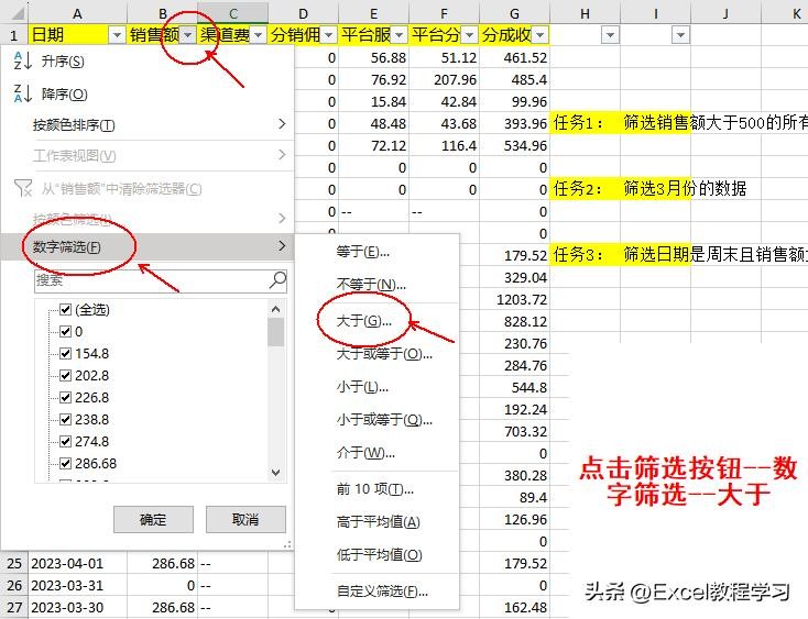 任务1:筛选销售额大于500的所有数据,这个任务我们利用基础筛选功能来完成;