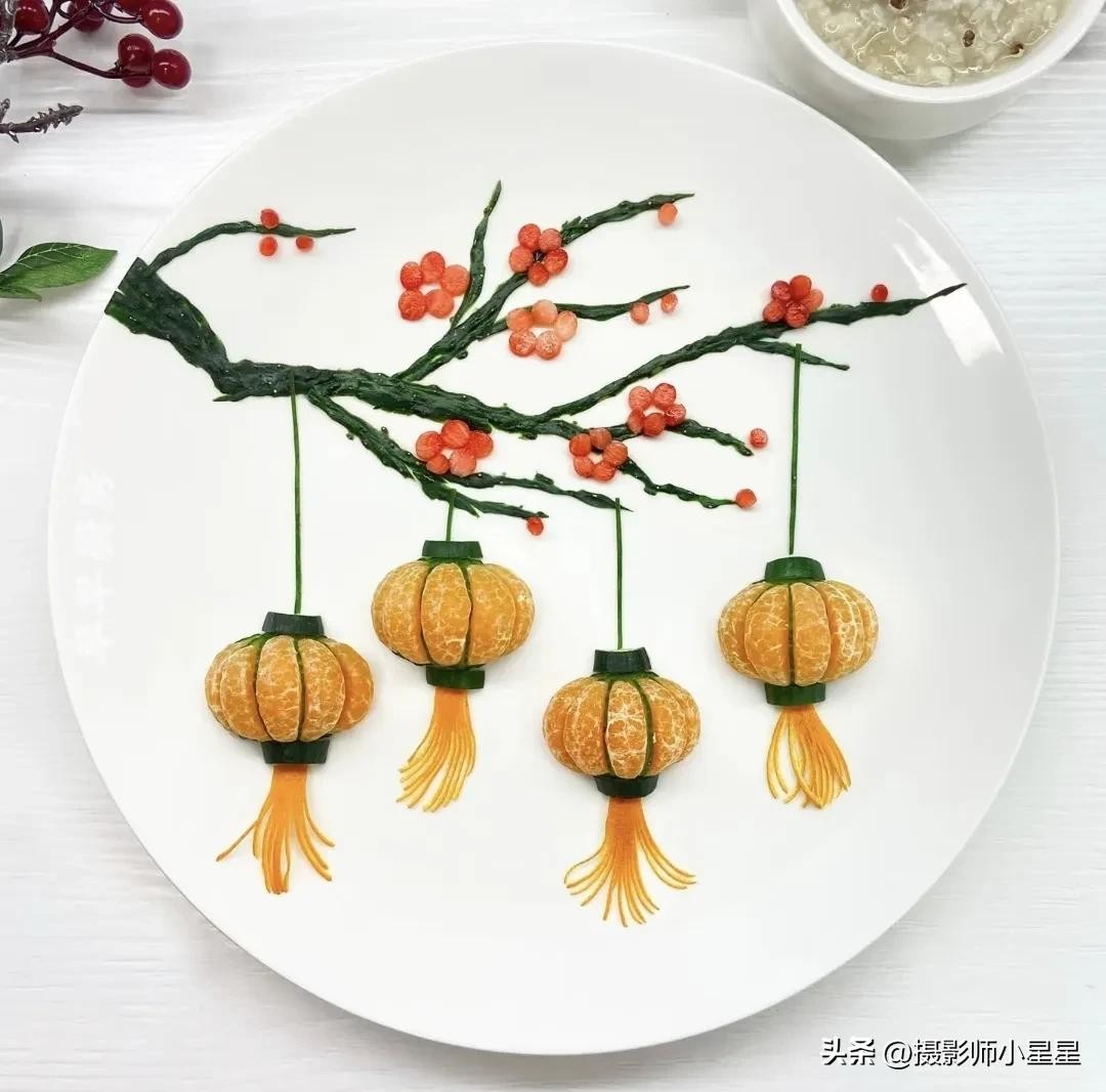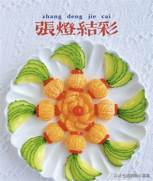 这组水果摆盘作品以灯笼为主题,将水果摆成灯笼的形状,展现出一种喜庆祥和的美感。在摆盘中,一个个由橘子和黄瓜组成的灯笼围成一圈,栩栩如生。橙色代表着阳光与活力,寓意着新的一年里,人们的生活充满阳光,充满希望。