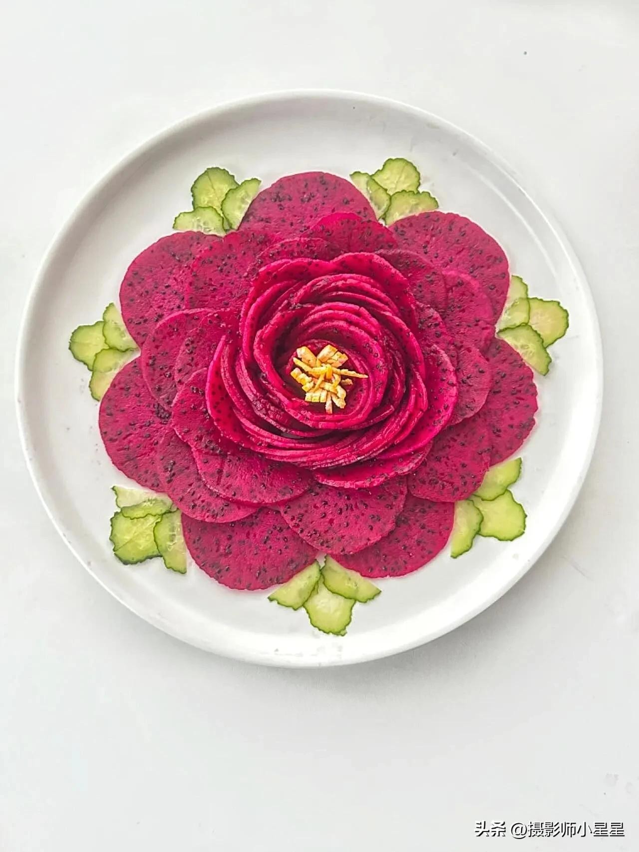 这组水果摆盘作品以鲜花为主题,将水果与花卉巧妙结合,营造出一种生机盎然、繁花似锦的氛围。在摆盘中,红彤彤的火龙果被精心摆放成一朵朵盛开的花朵,花瓣鲜艳,仿佛在向人们传递着春天的气息。