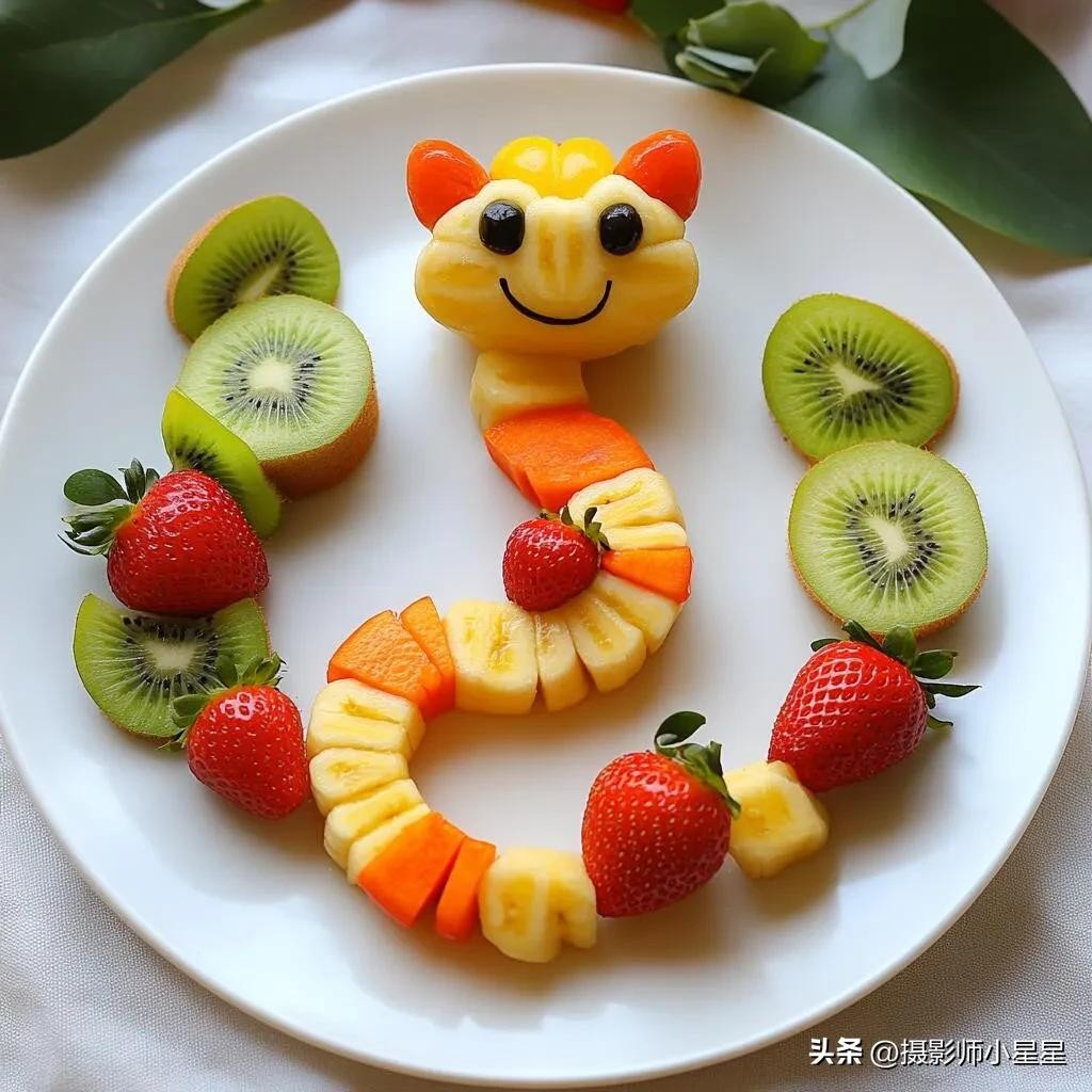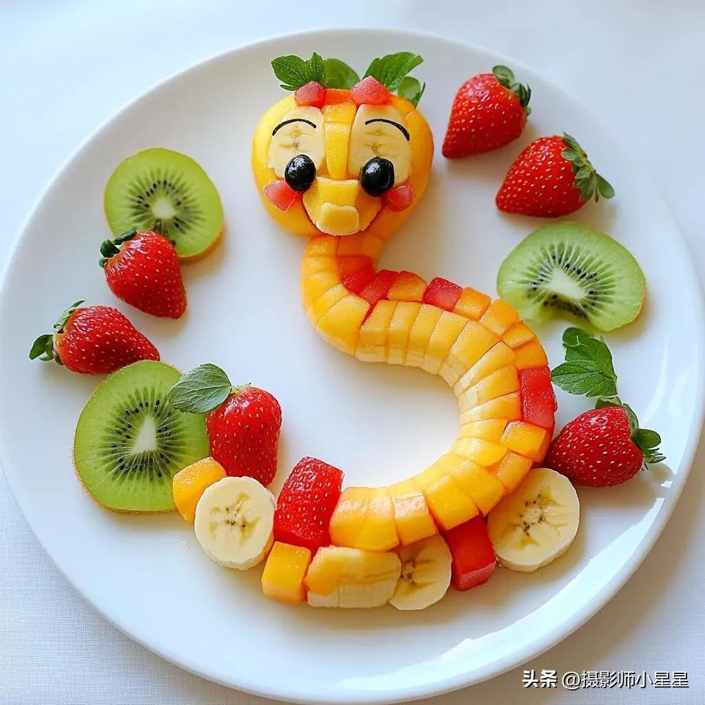 蛇的身上还镶嵌着一些猕猴桃,增添了摆盘的色彩和层次感。水果的圆润和饱满代表着丰收与富足,寓意着新的一年里,人们能够收获满满的财富和好运。