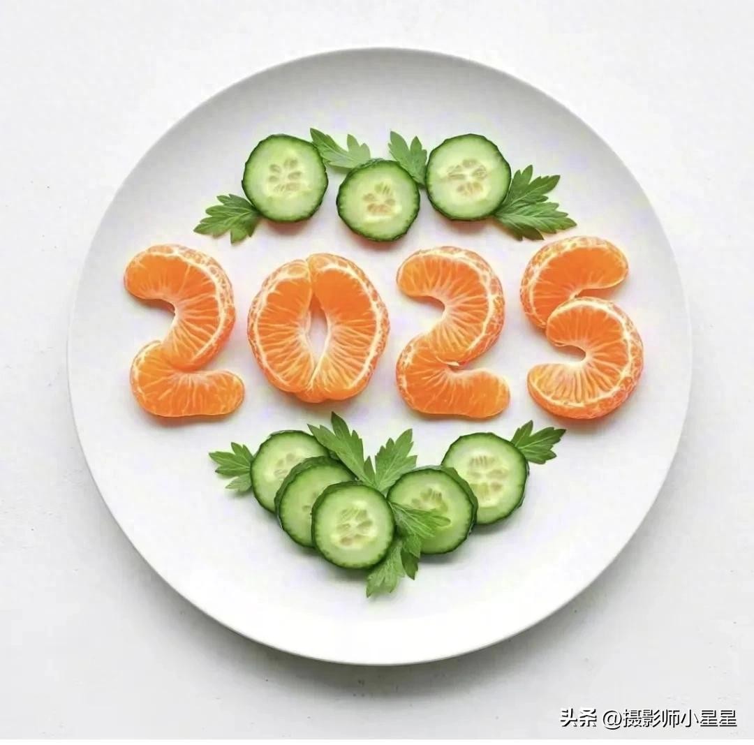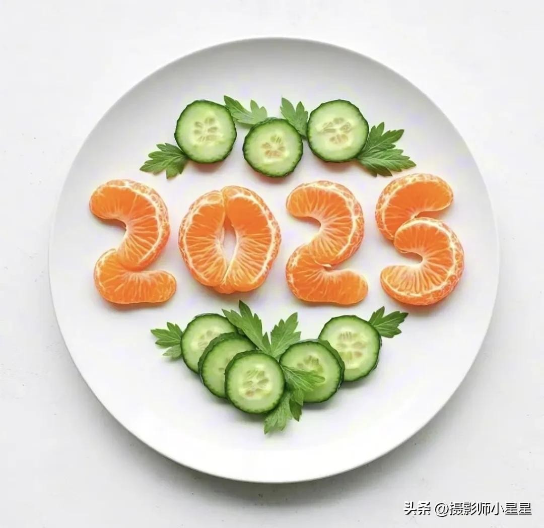 这组水果摆盘作品以数字“2025”为主题,将水果巧妙地组合成数字的形状,展现出一种简洁而大气的美感。在摆盘中,数字“2025”由橘子、黄瓜等水果拼接而成,色彩鲜明,层次分明。