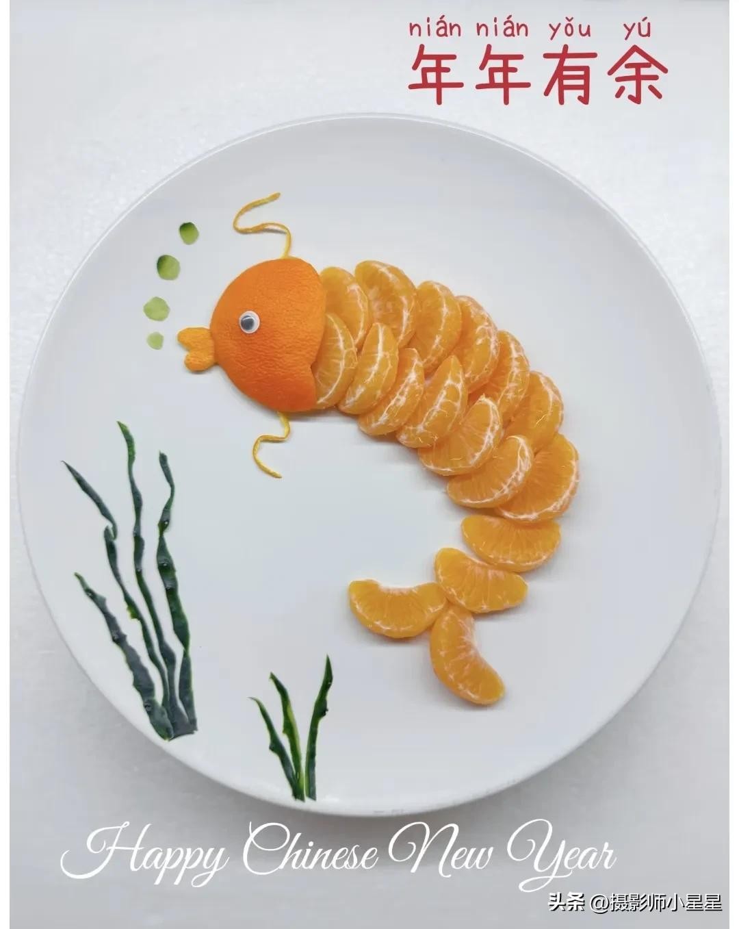 “年年有余”是中国传统的新年祝福语,寓意着新的一年里,人们的生活能够富足有余,事业有成,家庭和睦。鱼在中国文化中有着丰富的象征意义,它代表着富足与丰收,能够给人带来好运和幸福。这组水果摆盘作品以其独特的造型和美好的寓意,为春节增添了一份喜庆与祥和,让人们在欣赏的过程中感受到新年的美好与希望。