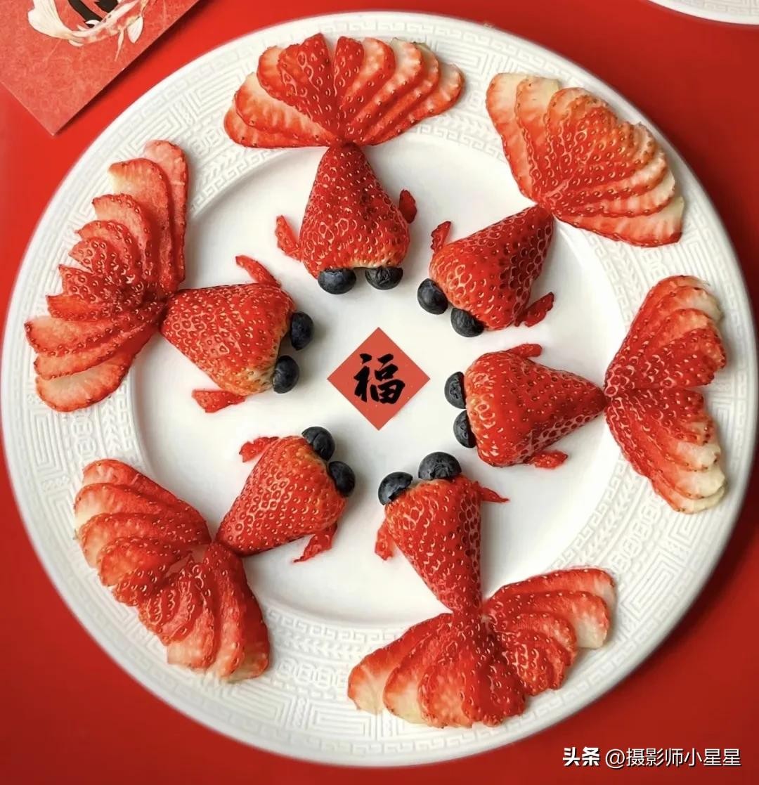 年年有余象征着财富与丰收,寓意着新的一年里,人们能够收获满满的财富和好运。这些水果增添了摆盘的色彩和层次感,草莓的红色代表着热情与活力,寓意着新的一年里,人们充满激情,积极向上,勇敢地追求自己的梦想。