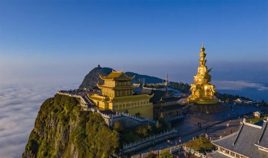 说到四川乐山的峨眉山,那可是个灵秀之地,特别是山顶的金顶,上面有座赫赫有名的华藏寺,它是咱们国家海拔最高的佛教寺院,听着就让人心生敬畏。一走到华藏寺前头,你就能看到那座庄严的十方普贤菩萨圣像,金光闪闪,仿佛在普度众生。