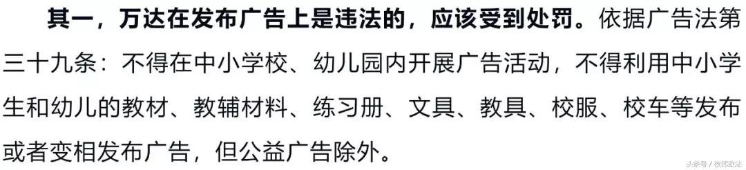 采访中,刘俊海补充谈到,庸俗的万达把铜臭气传给孩子们的行为同时违反了广告法第十条:不得损害未成年人和残疾人的身心健康。孩子们不仅仅需要身体健康,也需要灵魂健康。