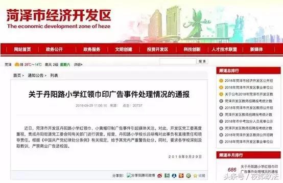 28日,《法制日报》独家报道了“小学生红领巾上竟印‘万达’广告!”一事,引发社会广泛关注,舆论圈一片哗然。山东省菏泽市经济开发区官方网站29日发布《关于丹阳路小学红领巾印广告事件处理情况的通报》,称责成丹阳街道党工委会同有关部门进行调查。经查,丹阳路小学校长吕咏梅对此事负有直接责任和领导责任。根据《中国共产党纪律处分条例》有关规定,给予其党内严重警告处分。同时,要求各学校深刻汲取教训,严禁商业广告进校园。