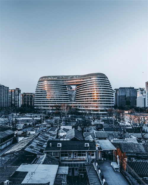 北京的地标建筑之一,东二环的银河SOHO,拥有外太空一般的科幻景致,银河SOHO实现了人文生态与自然生态的统一,总体空间布局上运用了非对称式的布局,显得自由、灵活。