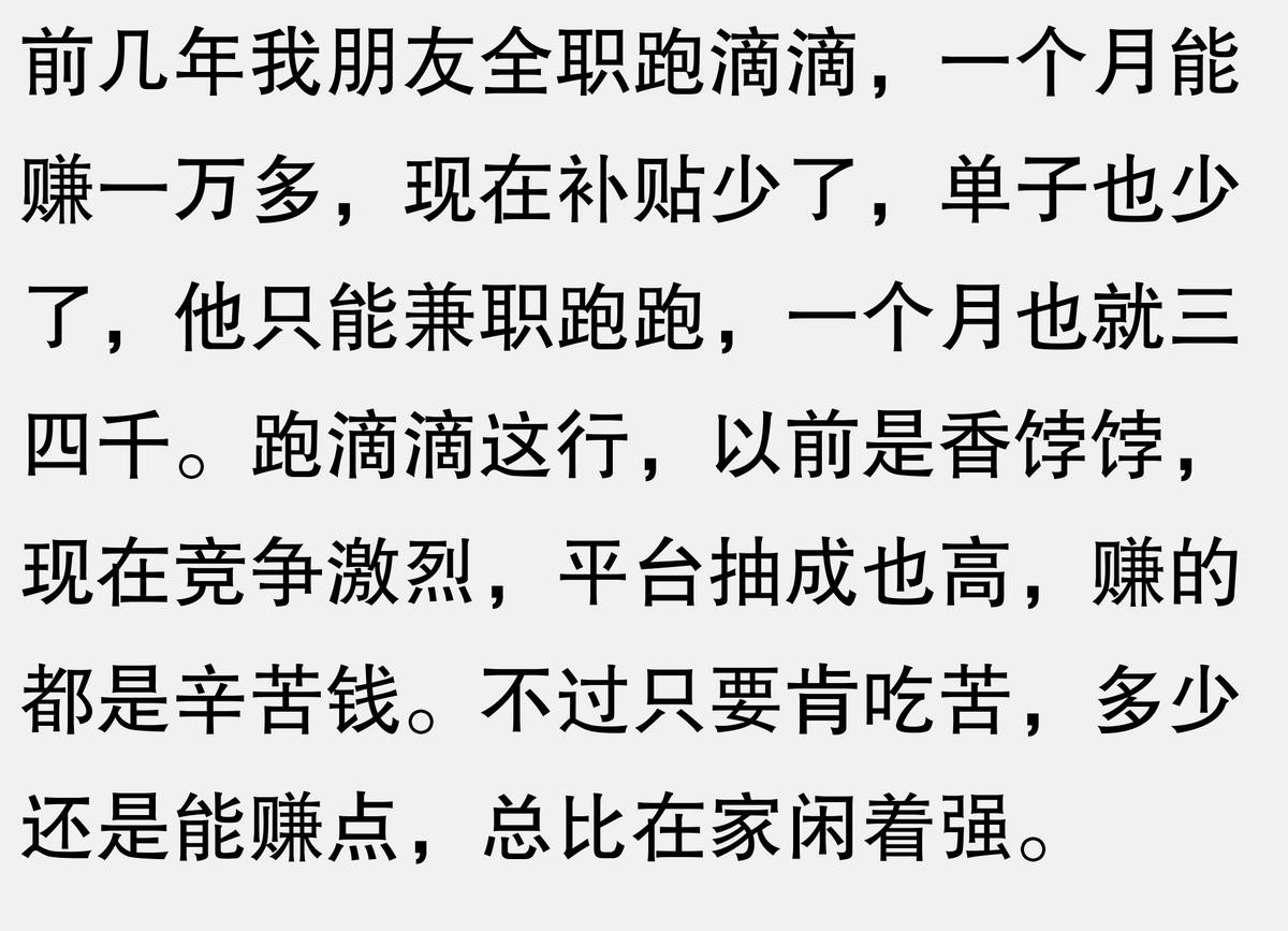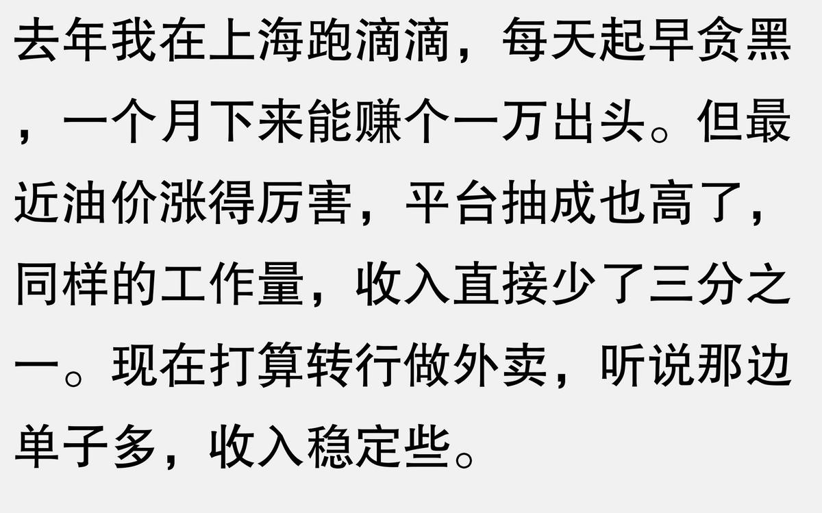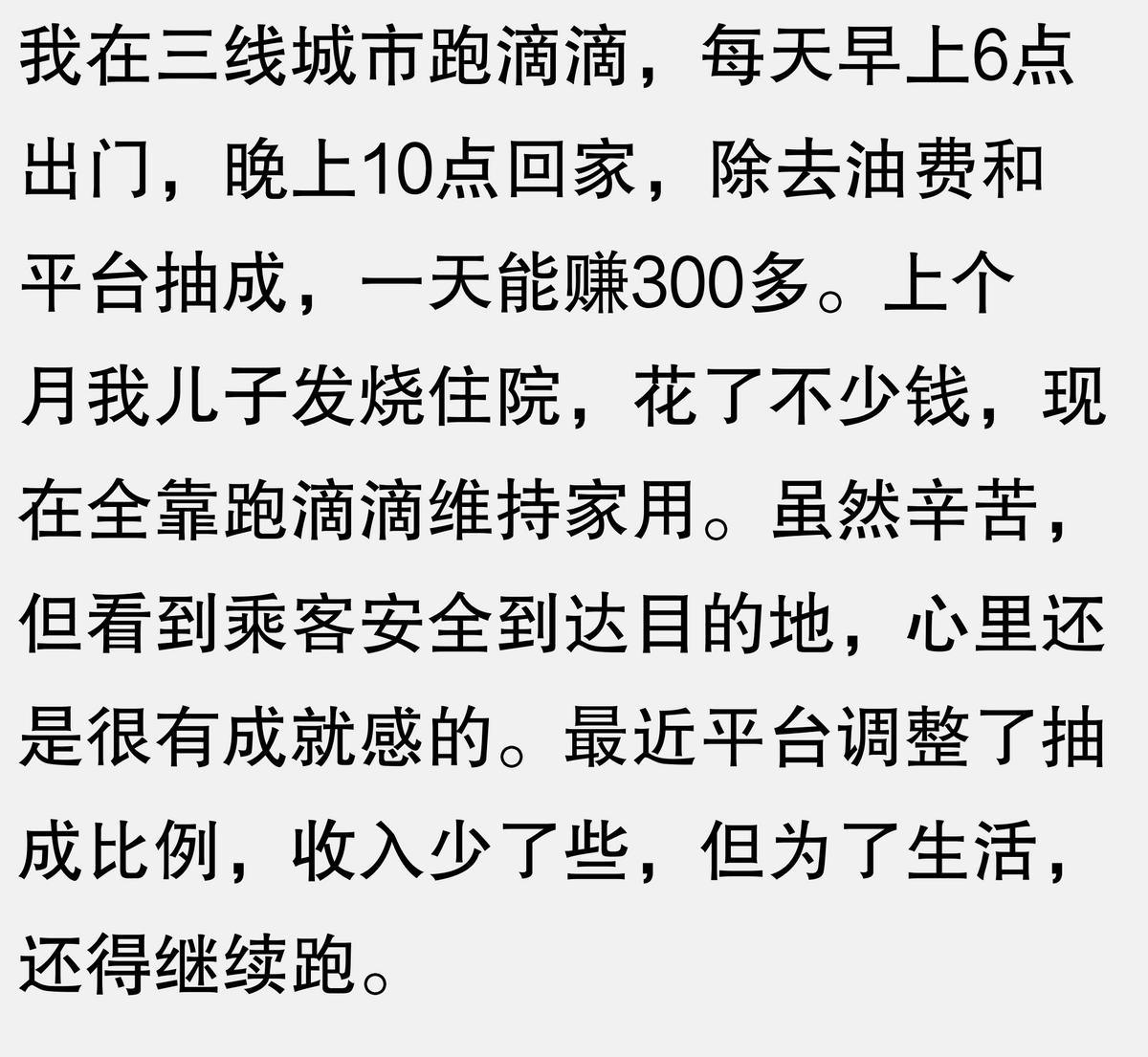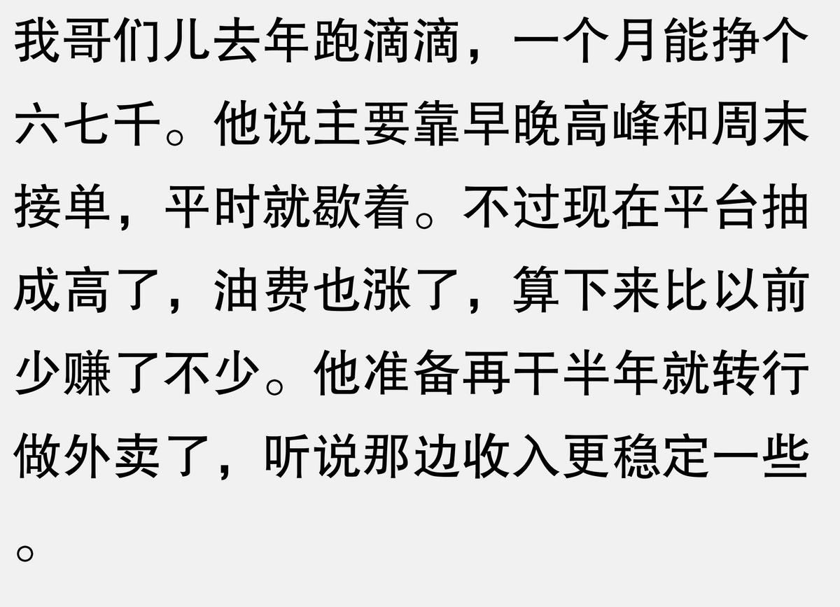 我朋友去年开始跑滴滴,刚开始收入还行,后来平台抽成越来越高,他每天跑12小时,到手也就三四百。现在他改行送外卖了,说至少不用被平台压榨得那么狠。