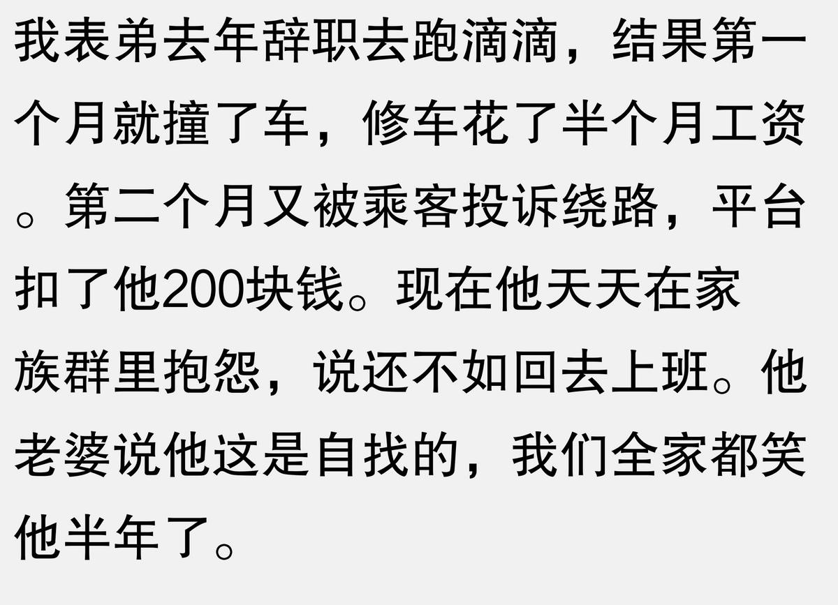 我开了三年滴滴,现在月收入不到5000。昨天接了个单,乘客问我:师傅,跑滴滴能赚多少?我说:赚不了多少,勉强糊口。乘客说:我看你都开这么久了,肯定是没啥问题。我说:我开是因为我没别的技能,我单纯以为能养家糊口。