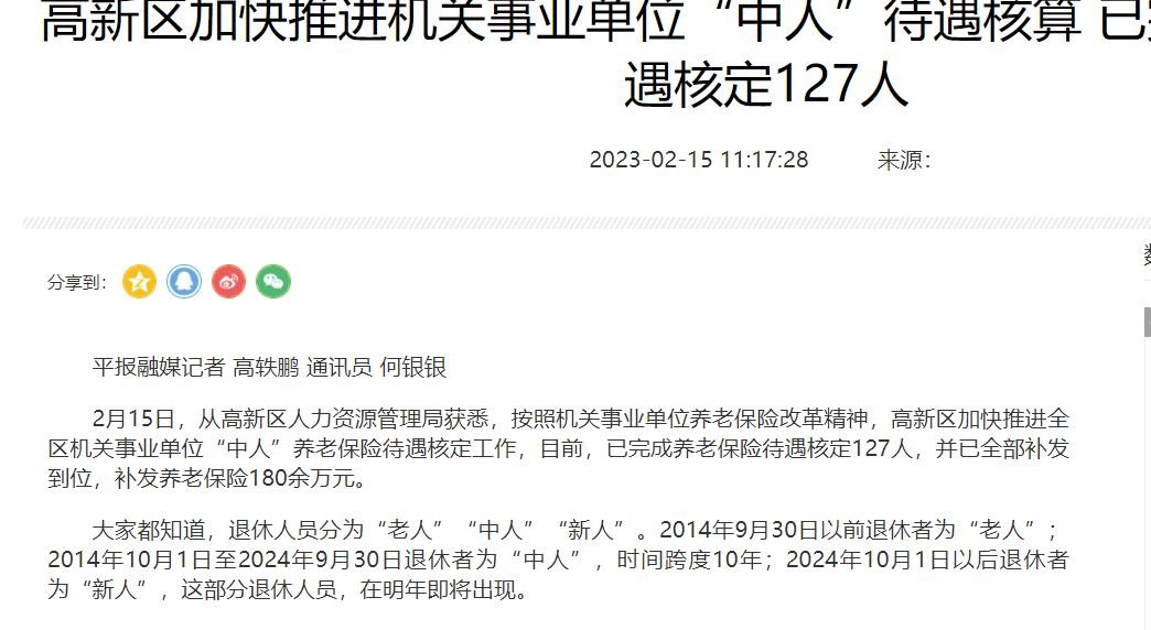 河南平顶山高新区2月份完成了127位机关事业单位“中人”待遇核算,补发金额180余万元。