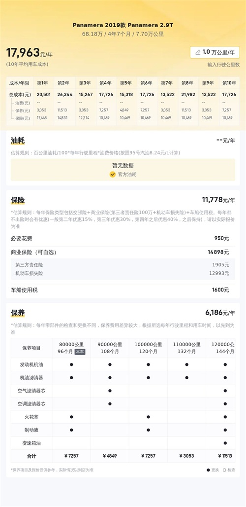 据估算,Panamera 2019款 Panamera 2.9T的用车成本是21792元/年,而同级车的最低用车成本是19316元/年,最高是43784元/年,所以它的用车成本较低。