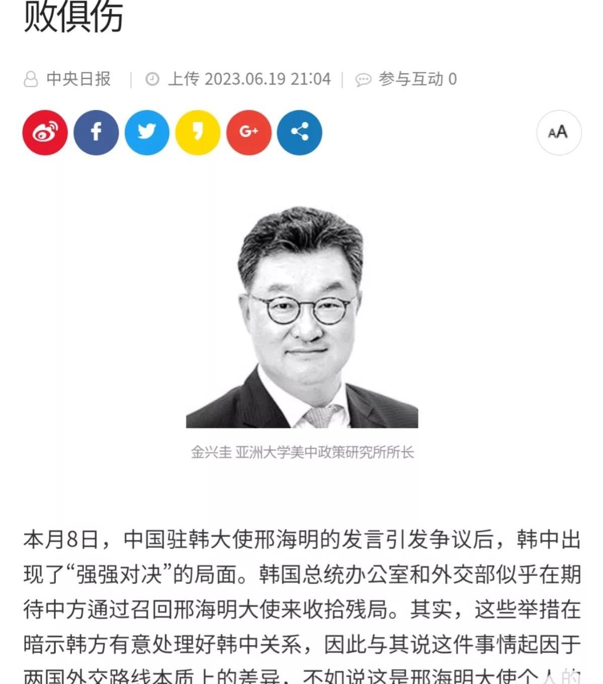 事件的起始点,源自一篇韩国媒体中央日报的文章,题为“强强对决只能让中韩两败俱伤”。这篇文章的作者是亚洲大学美中政策研究所所长金兴圭。文章开头便指出:“驻韩大使邢海明言论引发争议后,韩国有意处理好韩中关系,等待中方通过召回邢海明大使来收拾残局,但中方却对此予以正面拒绝。”这样的叙述似乎表明韩国方面对于邢海明大使的言辞感到不满,并期待中国方面采取行动以化解局势。