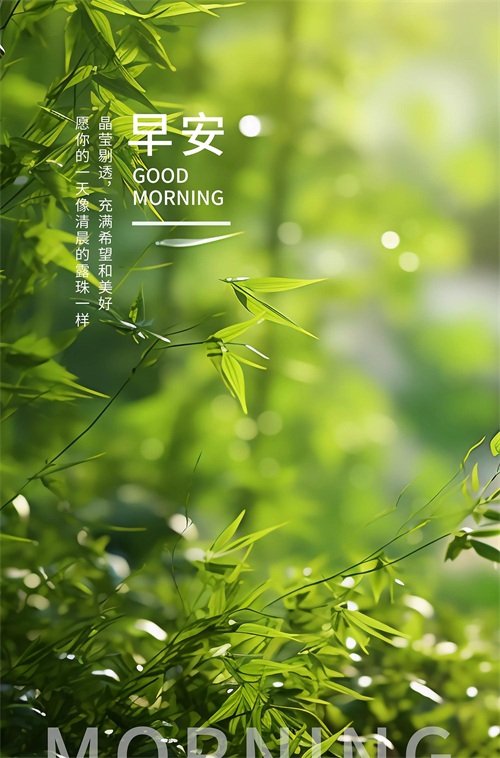 早安!清晨的竹叶上,一颗颗露珠在阳光下闪闪发光,让我们一起迎接这个美好的早晨,伴着竹叶的清香,让阳光和绿色治愈,扫去未来的一切疲惫。