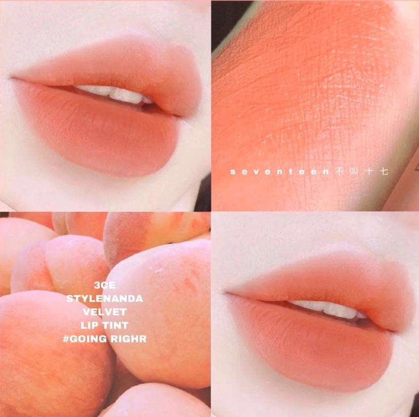 如果想成为蜜桃女孩,下面推荐的这个色号也一定要入哦,这个是3CE丝绒唇釉# going right