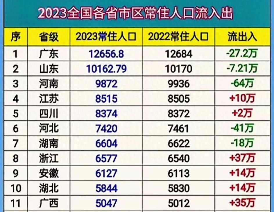 截止目前,31个省市2023年常住人口出炉,常住人口超过一亿人的有2个省份,分别为广东(12656.8万人)、山东(10162.79万人),遗憾的是这两个人口大省2023年常住人口都是流出的,广东流出27.2万人,而山东流出7.21万人。
