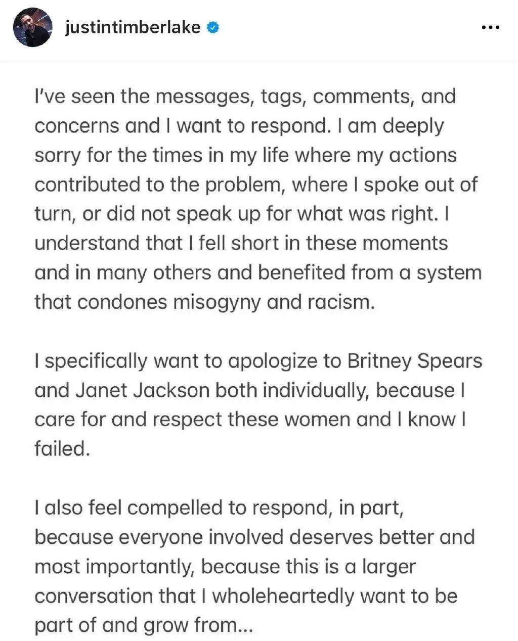 布兰妮的前男友贾斯汀·汀布莱克,也在个人社交平台对布兰妮道歉。