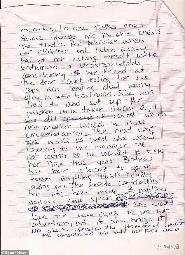 《每日邮报》也曝光了布兰妮在2009-2010年期间以第三人称口吻写给朋友的亲笔信,信中布兰妮自述:孩子被夺走、强行被赶进精神病院、遭到团队威胁不能发声……