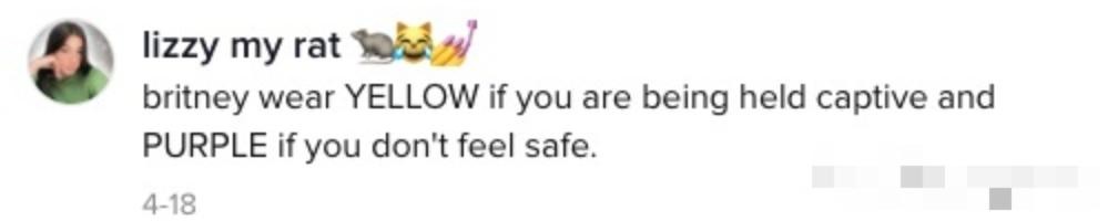 有人在布兰妮的ins下留言,说如果你被控制了就穿黄色衣服,如果你是安全的就穿紫色。